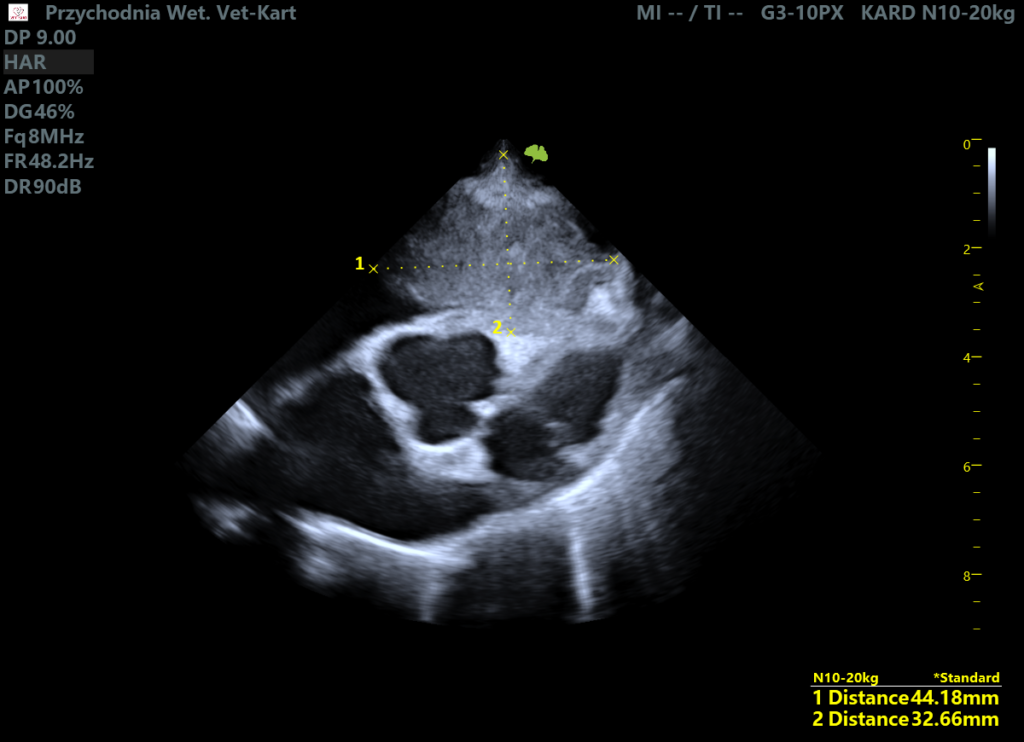 Kluczowym znaleziskiem była dobrze zdefiniowana, niejednorodna, hipoechogenna względem wsierdzia zmiana o wymiarach 4,4 × 3,3 cm, zlokalizowana na wysokości zastawki trójdzielnej, związana z jej płatkiem/pierścieniem. Masa poruszała się synchronicznie z ruchem zastawki i powodowała częściową obstrukcję.